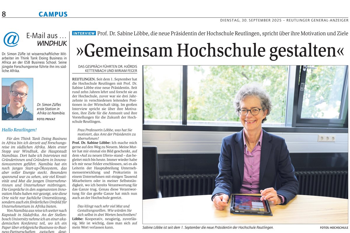 Seit dem 1. September hat die Hochschule Reutlingen mit Prof. Dr. Sabine Löbbe eine neue Präsidentin. Im großen Campusseiten-Interview spricht sie über ihre Motivation, ihre Ziele für die Amtszeit und ihre Vorstellungen für die Zukunft der Hochschule Reutlingen.