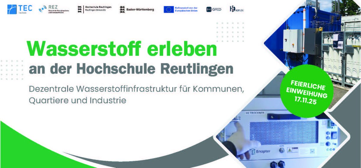 Das gesamte Team der „Wasserstoffwelt Reutlingen“ als Teil des Reutlinger Energiezentrums freut sich sehr, Sie zur feierlichen Einweihung der Wasserstoffinfrastruktur für die Lehre und Forschung an dezentralen Energiesystemen am 17.11.25 von 14-19 Uhr einzuladen. In einem gemeinsamen Festakt möchten wir unsere Forschungsprojekte vorstellen und mit Ihnen in einen gemeinsamen Austausch für eine dezentrale, nachhaltige und vernetzte Wasserstoffversorgung treten. Wir freuen uns darauf, mit Ihnen diesen Meilenstein gemeinsam zu begehen.